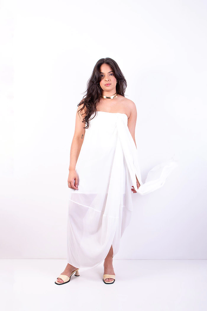 vestido longo branco sem alças com estrutura no busto Renata Figueiredo