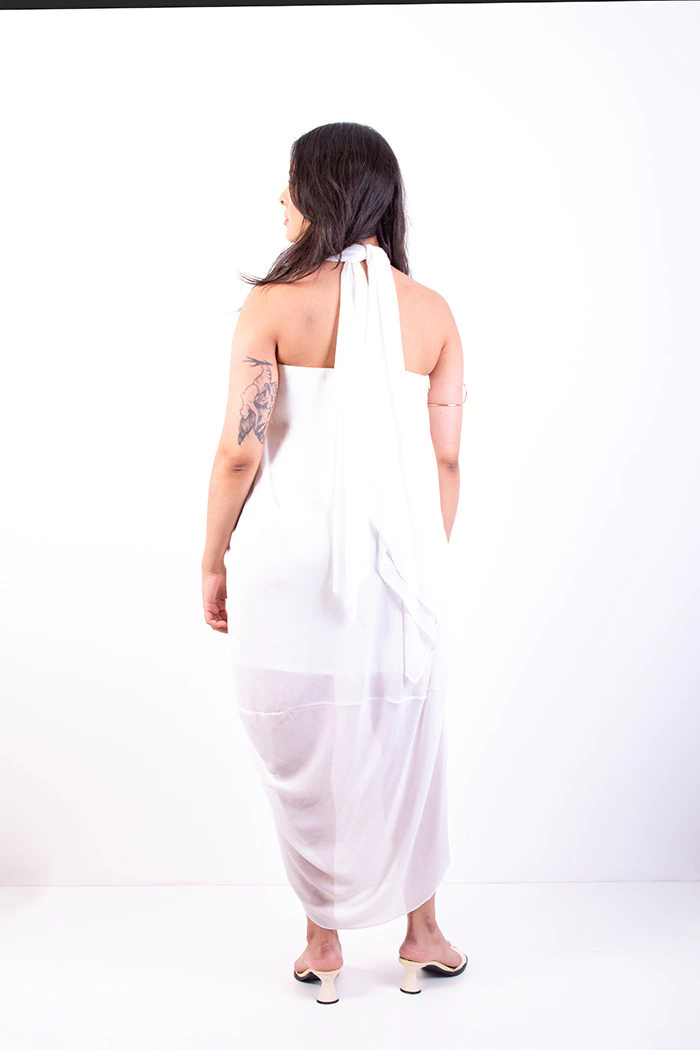 detalhe de tule que pode tanto ser usado tanto transpassando no pescoço, quanto solto para trazer mais fluidez pra peça